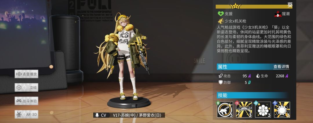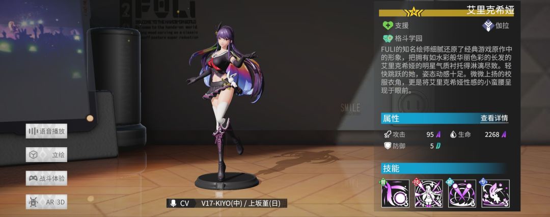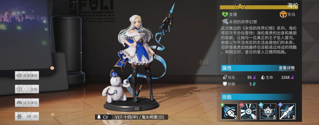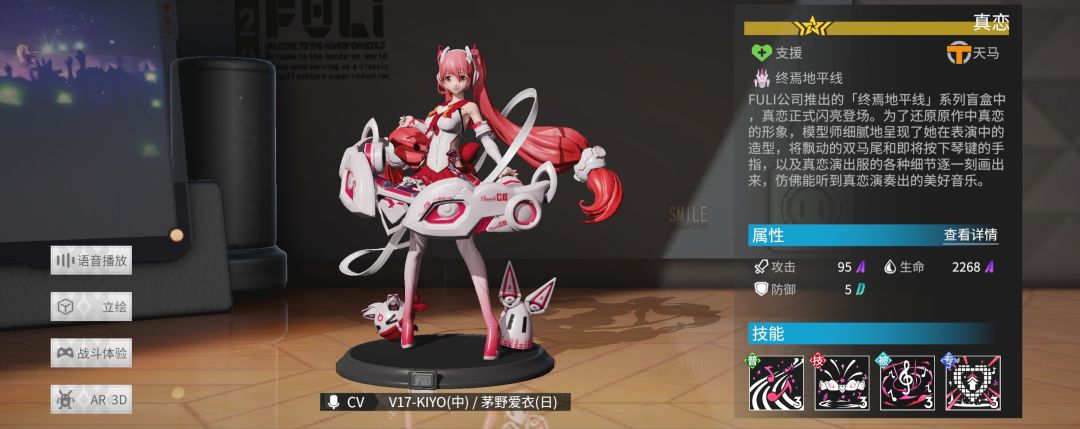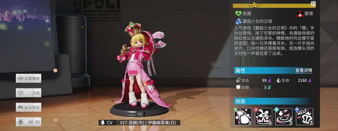 技能效果为“治疗所有友军手办,并使自己以外的手办提升16点能量”,满级为治疗友军,回能额外提升至24,并随机冰霜两名敌人5秒。