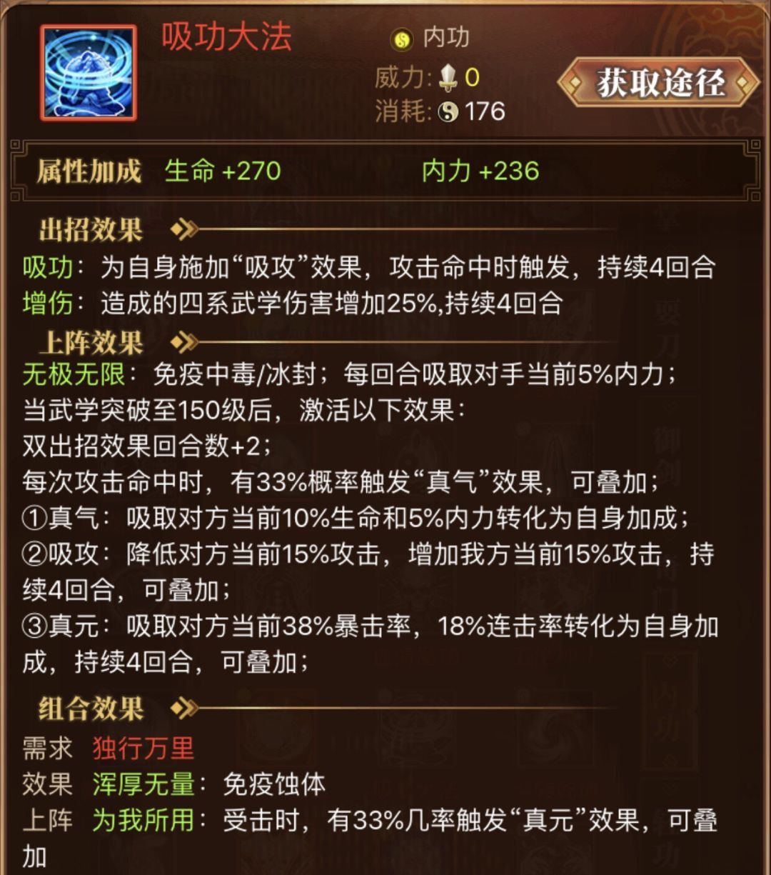 玩吸攻的朋友应该都有这种感觉,比起明玉,四照,斗转,来说,节奏太慢,速度太慢,现在驱散泛滥(流星,菩提,斗转……各种招式),吸攻其实用处占比比较大的就是吸内吸血;吸攻吸连暴buff难挂,有时候挂上去也没在对方攻击回合,所以相对作用较小。
