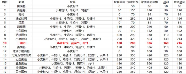 面包盈利表,贝壳面包并不是赚的最多的(只更新到我做出来的面包)