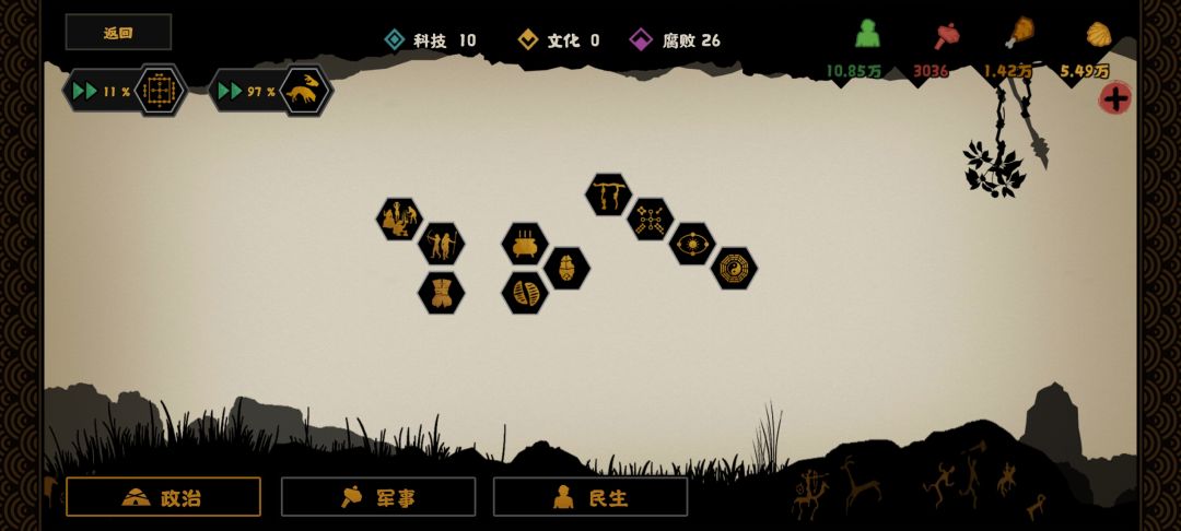 此外,在前期科技术的选择上,尽量以人口,粮食以及军队战斗力为主。前期不要花费大量的精力放在资源点和特殊物品产量上,因为如果领土不足,特殊物品的产量自然就会少。而且前期对于特殊物资的需求并不是很大,完全可以通过日常的战斗来进行补充。
