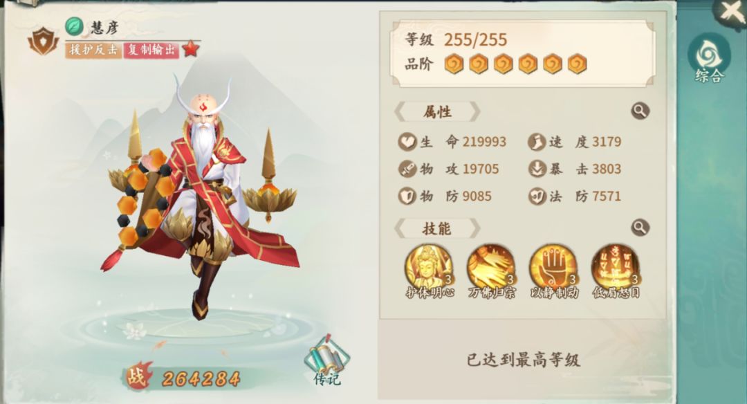 T0级别:慧彦(十星有着3179的基础速度,能够让其1技能护体明心提前释放大幅提高队伍伙伴生存率还能为低速度队友提供额外速度,速度在后期使很重要的这点后续说明。2技能复制友方最高攻击、暴击、伤害攻击对位单体,还有较高概率反击巨额伤害,能打能回血,优秀的输出与反击机制,冷却一回合,触发频率高,是极高性价比的技能。3技能以静制动是及其强大的控制技能,在没有本方没有柒的情况下或对方没有李靖的情况下,基本必定触发2回合的封魔,尤其是现在人均月儿的大环境下,这点及其重要,能让对面立马哑火,该技能为被动技能,基本每回合都会触发,to级别的频率。四技能提升自身生命,受伤后获得禅意使自身伤害减免增加。
