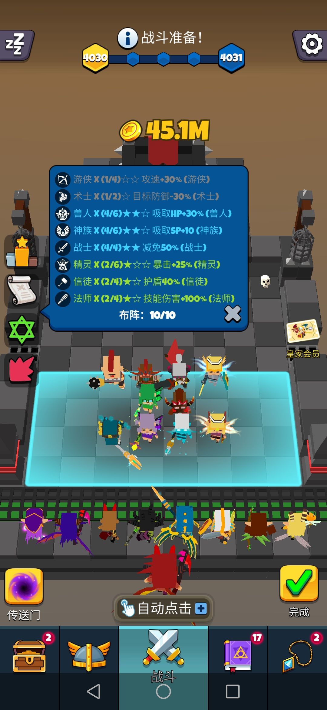 羁绊:4兽人吸取HP30%,4神族吸取SP+10,4战士减伤50%,2精灵暴击+25%,2信徒护盾+40%,2法师技能伤害+100%
