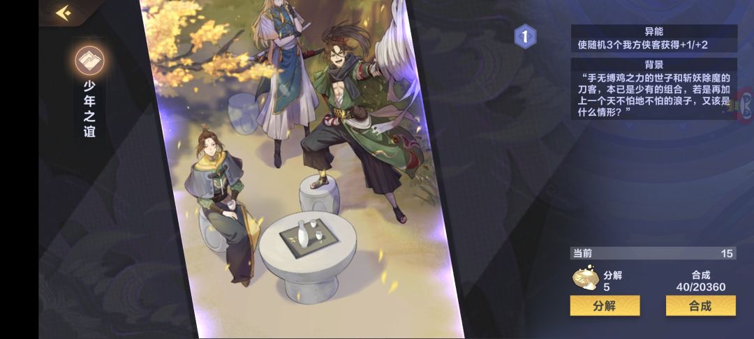 少年之谊,一费,最高三侠客+1+2,超值,完全不用等到3侠客才用,2侠客使用都是赚到,前期就是抢节奏,配合王小虎,更是强力,不要犹豫用就是了