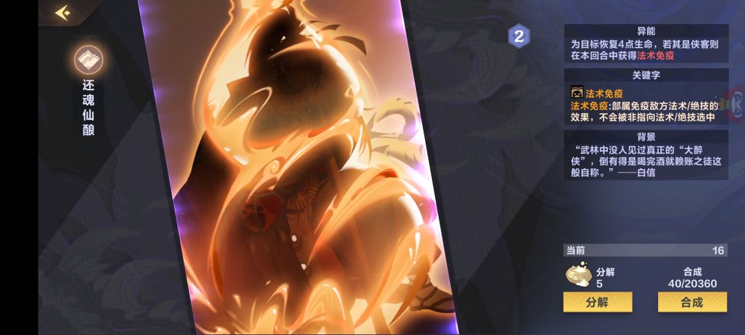 强力的combo卡来了,哈哈,土系也终于迎来了自己唯一的一张专属魔免卡😊还魂仙露前期如果入手了,千万不要随便用掉,前期如果不能很快拿下对手,那么到了龙峰大叔的大招回复好的那个回合,起手还魂仙露+吹猪,对面几乎无法破解,如果结结实实的挨上这么两下,基本结束战斗了😁