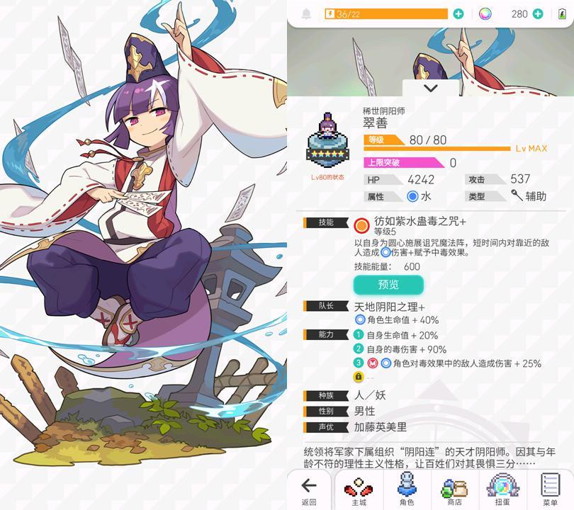 翠善作为合击队员可以帮助主角色撑血,补足血量上的补足。但600能力大招可能会拖慢主角色的充能。虽然靠毒可以过本,但过长的通关时间会导致SS评分获取困难。现阶段翠善的就业情况有点堪忧,只能说一句未来可期。