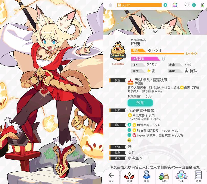 和光黑皮同款的队长技能,可以作为雷Fever队长使用。但和光黑皮不一样的是,稻穗并没有让队伍快速进入fever的能力。更推荐作为队员或合击插件进入其他队伍。