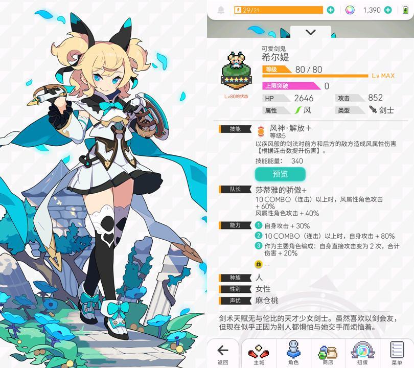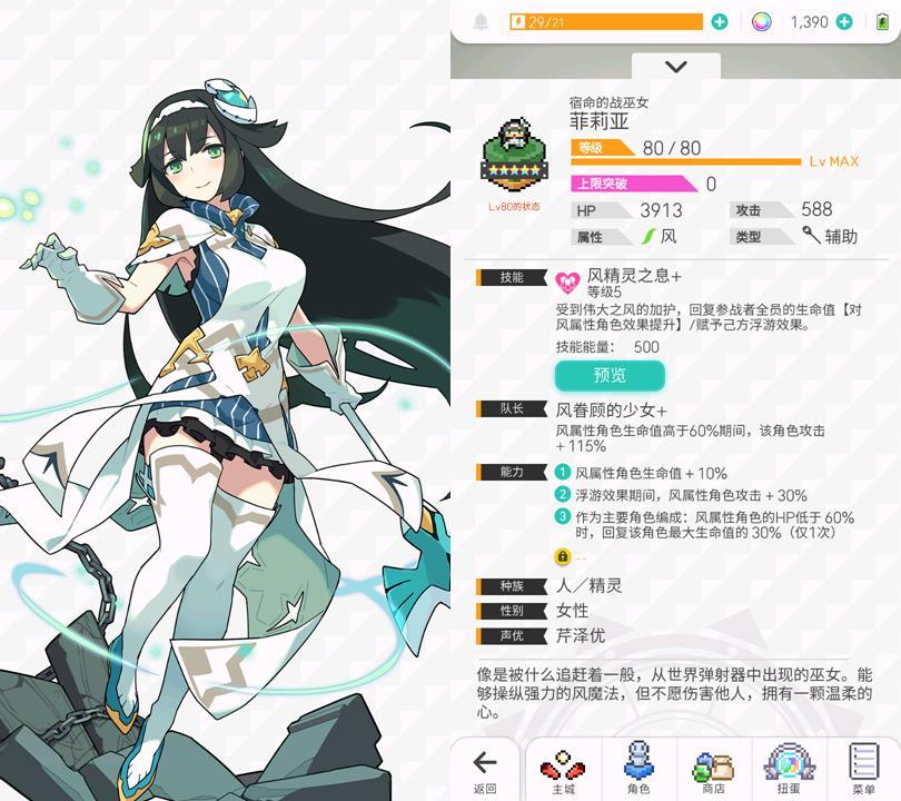 主动技能拥有治疗+浮游使得她可以胜任风系任何队伍的治疗位,也可以在后台提供浮游效果。实际上在后期她经常会出现在风系队伍的合击位,提供浮游和治疗。