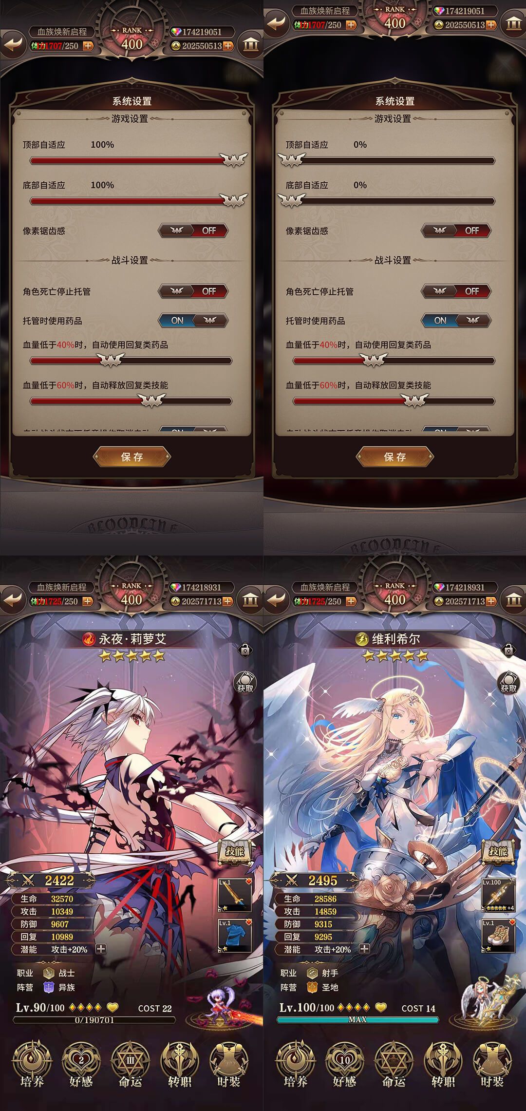 此外新版本也加入了屏幕自适应相关的功能,毕竟老版本的血族在开发的时候市面上最好的手机还是iPhone4,当年谁也没有想到屏幕的显示比例会进化到今天百家争鸣的样子。顺便提一下,屏幕显示比例高于16:9的情况下,可以在设置中调整屏幕顶部和底部资源栏和导航栏高度的哦~