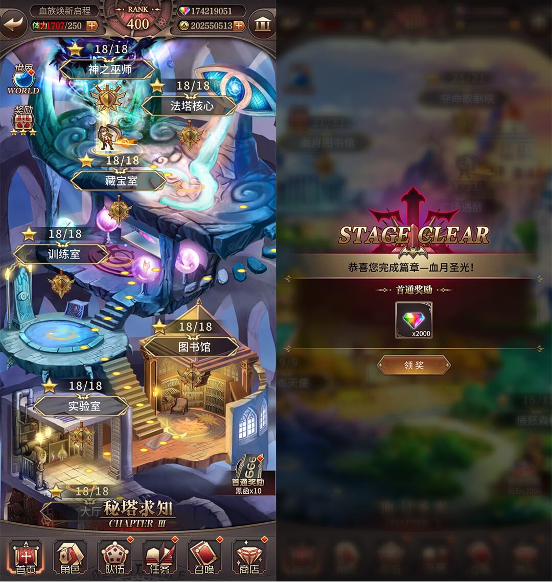 首次通关相应主线篇章时,可以直接领取到包括钻石和黑函在内的各种奖励。
