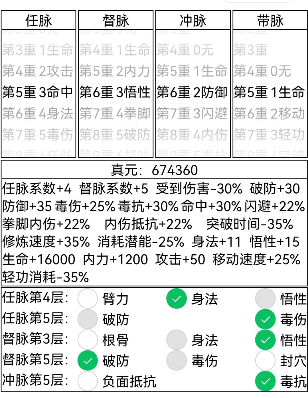 四、九剑不能识破化功和生死符,面对极限身法流(一般有195或者200身法)后手的情况下可能会被化功生死符克制的很厉害(太极套内力比拼劣势),三个近战技能又会被被动封穴,面对顶级氪佬的北冥可能撑不住两下吸星被活活憋死。所以这时候要掏出罗汉降魔功,除了金身就是识破,谁看到都会绕着走,就算能打的过也是看运气识破出的少。加上闪避会刷新识破,所以说对任脉的命中需求也不高,可以分出更多的真元加冲脉和督脉,任脉太高反倒起反作用,命中太多减少识破,被别人卡识破空档打出一套。而且悟性加点闪避低,基本上被打中三次就换来一次猫3准必闪。