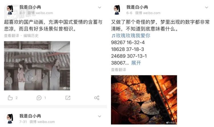 这两条动态中,一条是他的观影感想,配图中的几人都撑着纸伞;另一条则仍是他描述梦境的文字,后面依然附有神秘数字。这时候不管怎么想,后者都更有可能是正确答案,但恰恰相反的是,白小冉观看的这部动画才是关键。