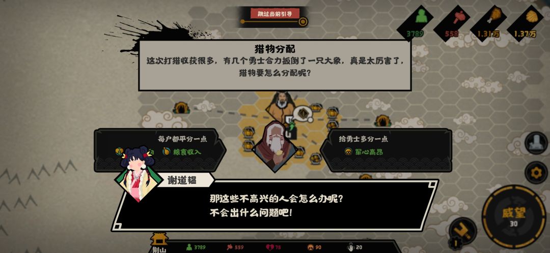 百姓是发展的主力,用于建造城池扩大领土,开采各类资源,这些都是国度运行的基础。游戏中不管是建造还是维持各类势力运行都需要资源。还可以通过百姓探索未知区域扩大领土,发掘物资等等。而发掘的武器有时候会出现在屏幕上,玩家点击图标即可收取。军队负责打仗,防御侵略和攻占领土,是统一天下的唯一办法。但百姓和军队似乎有着天生的矛盾,在各类突发事件中,总会碰到两者发生冲突,但其解决问题的选项中不管哪个都会偏袒其中一方导致另一方不满,造成相应的不良效果,而审时度势则是玩家做出艰难抉择的唯一要求。但任何事件都有着不确定性,很难猜测其结果,也可能你看似损失或影响不大的选项,在未来可能导致严重后果。而名臣带来的负面效果极少,大多都是对玩家有利的。