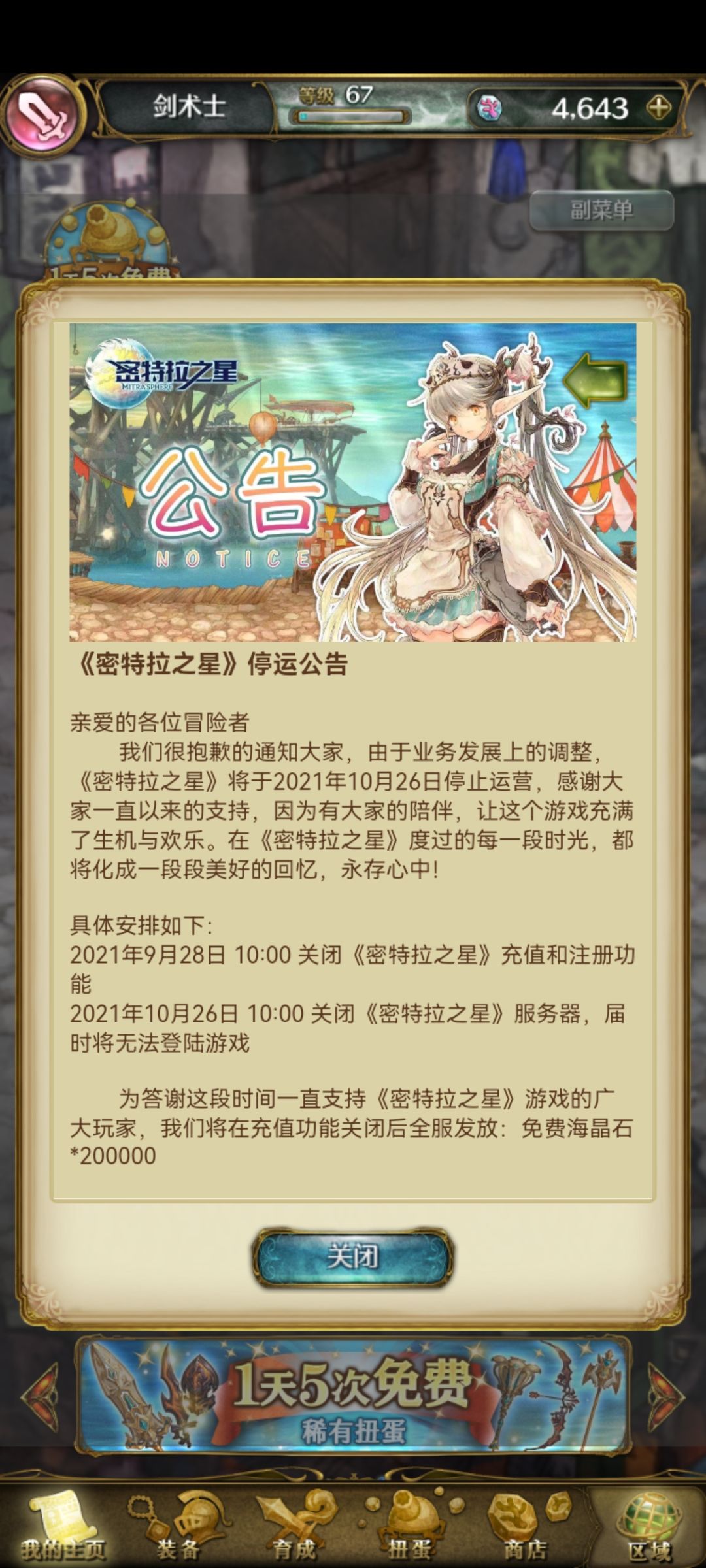 我是个比较抠的人,大多数游戏除了充个月卡基本就不充钱了,这算是少数充了将近1000多的游戏,还记得过年的那段时间,这游戏还挺热闹的和群里的朋友们一起通宵刷一个boss,一直死,一直刷,最后也不知道刷了多少遍了才过的,以至于后来一起组队没人死的时候都感觉不可思议了,后来这游戏慢慢的凉了,群里的人也基本不说话了,我现在也就每天上线假分享一下再领个奖励30石头入手就下线了,今天仔细一看公告就听说要关服了还挺伤心的,虽然已经没有人一起玩了,但好歹这里也有不少的回忆呢