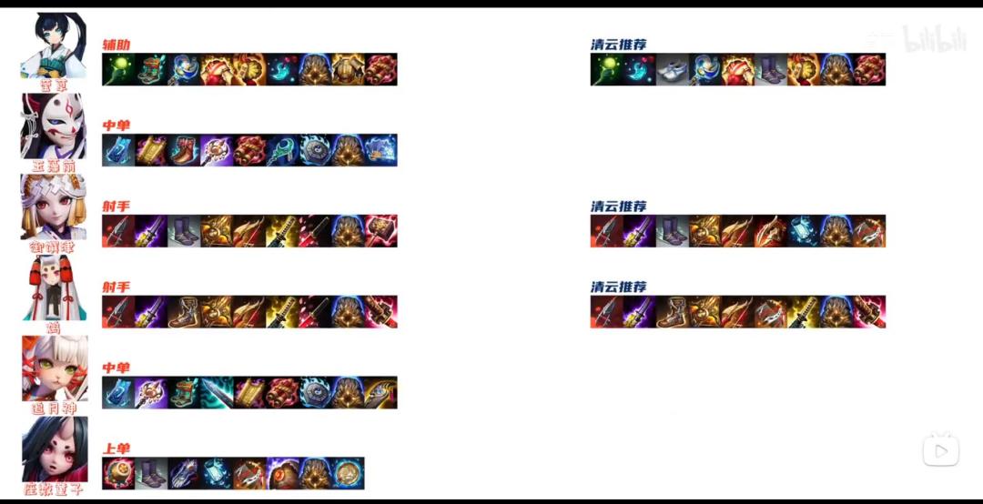 以下是up在教学视频中展示的推荐出装,因为是年初开始做然后咕到现在的视频所以可能有部分推荐出装不符合版本,比如管狐推荐的双镰刀出装在现版本应该是不适用的,阿织十六谷的推荐出装也没有,选用时还须灵活变通。
