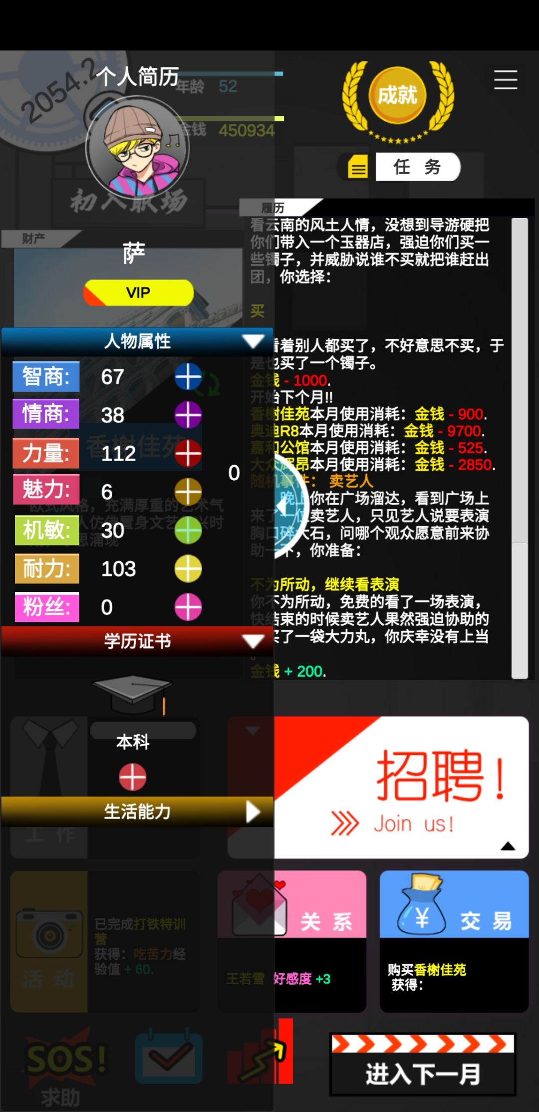 35岁提前退休 随机任务真的恶心 不切实际 好感度随机 很恶心 每天就是活动,隐藏活动,关系,商城买三个刷新买三个刷新买三个下一月手已经废了 总算玩明白了,希望优化一下随机事件,睡觉晚安各位 不懂的留言看到回复