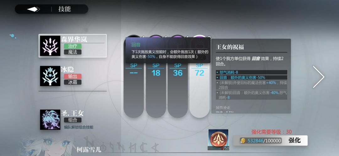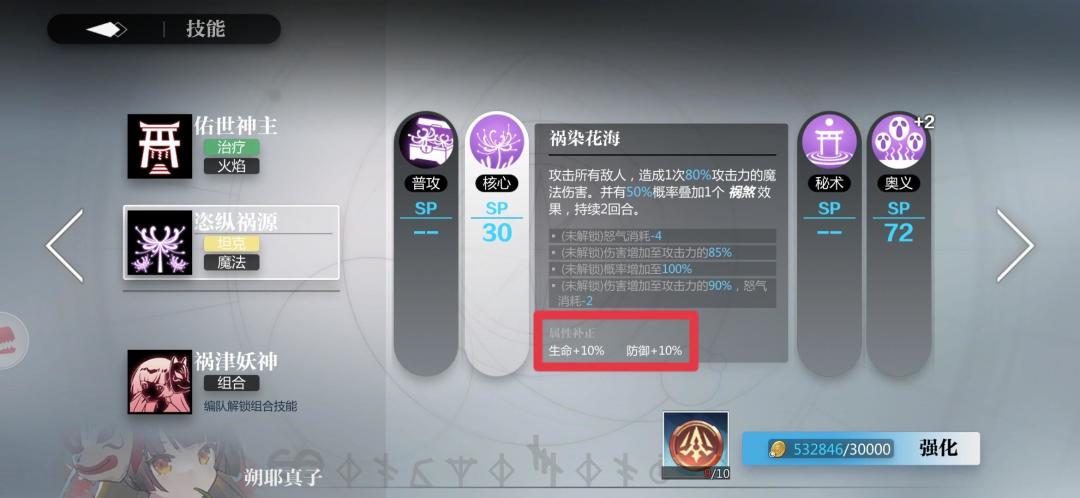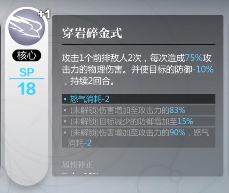 这个应该好多人不知道什么意思,这个属性补正就是你的人偶在携带了这个技能后她的属性所发生的变化,比如图上真子的核心技能,真子携带了一系技能,那么她就会增加9.5%的攻击,如果我给她换成的二系技能,那么这9.5攻击的加成就会改变成10%的生命和防御加成,所以各位在给人偶换技能的时候一定要注意这个补正