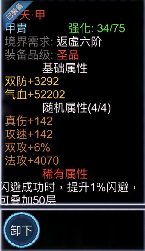 返虚装备掌天系列,对应境界返虚六层,七层,八层!每层两件。从装备效果上看,它走的是闪避流,目前测试过对pvp有些效果,boss精英怪的效果基本看不见,据说是因为命中太高,不知道以后能不能调整,称号系统就有70闪避了,加上攻击装备三件有27点闪避,特效20,道法30,返虚能叠147的闪避,返虚阶段称号最多能弄40闪避,氪佬除外,普通玩家最多117-147闪避。基本不被秒杀就无敌了,闪避配上抗爆,对手应该蛮难受的。