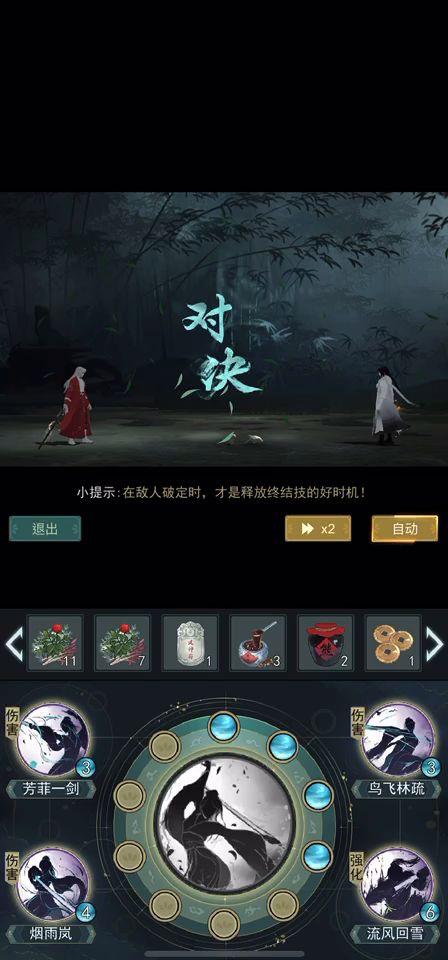 问酒:问酒是个不讲理的存在,减伤也比较高,纯莫思烟雨岚穿透一般第一回合打完进不了斩。因此建议直接考虑破定流,芳鸟前置只需要硬吃问酒第一回合攻势,问酒的第二回合我们交给鸟飞来防御,第三回合会被流风断条然后基本上就赢了,实测胜率6/4.