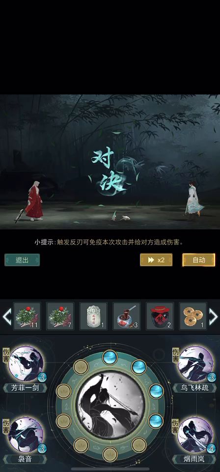 自动:老生常谈首发无,芳-鸟-烟-芳-袅-烟,这套自动的选择主要还是第一回合打出芳鸟烟的爆发,第二回合对方进斩杀线之后靠反刃和芳袅补伤害,如果玩这套建议8负伤或者4破4负伤的武器洗法。