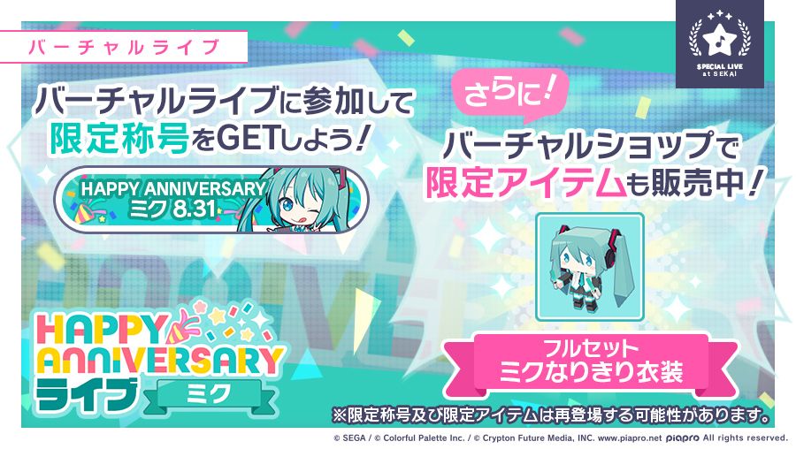 北京时间8月30日23:00起举办「HAPPY ANNIVERSARY LIVE MIKU」虚拟演唱会🎂