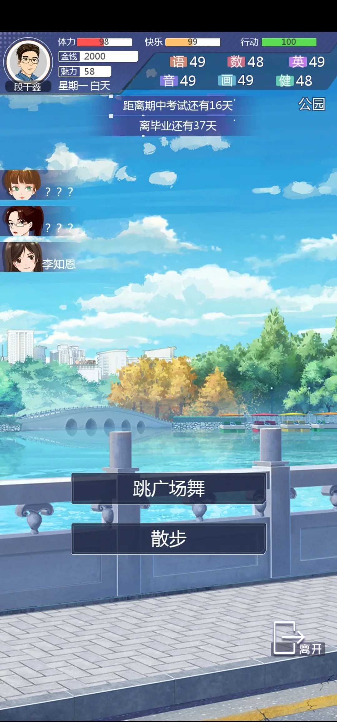 在学校,你可以通过上课、自习、参加社团、图书馆阅读等活动提升自己的文化课数值。不同的场所提升的数值量不一样,在每个场景的右下角即可查看。当然你还可以逛公园,去网吧,直播,健身等等众多方式来提升数值。恋爱诚可贵,学业价更高——万一考试通不过,可是要被劝退处理的哟。