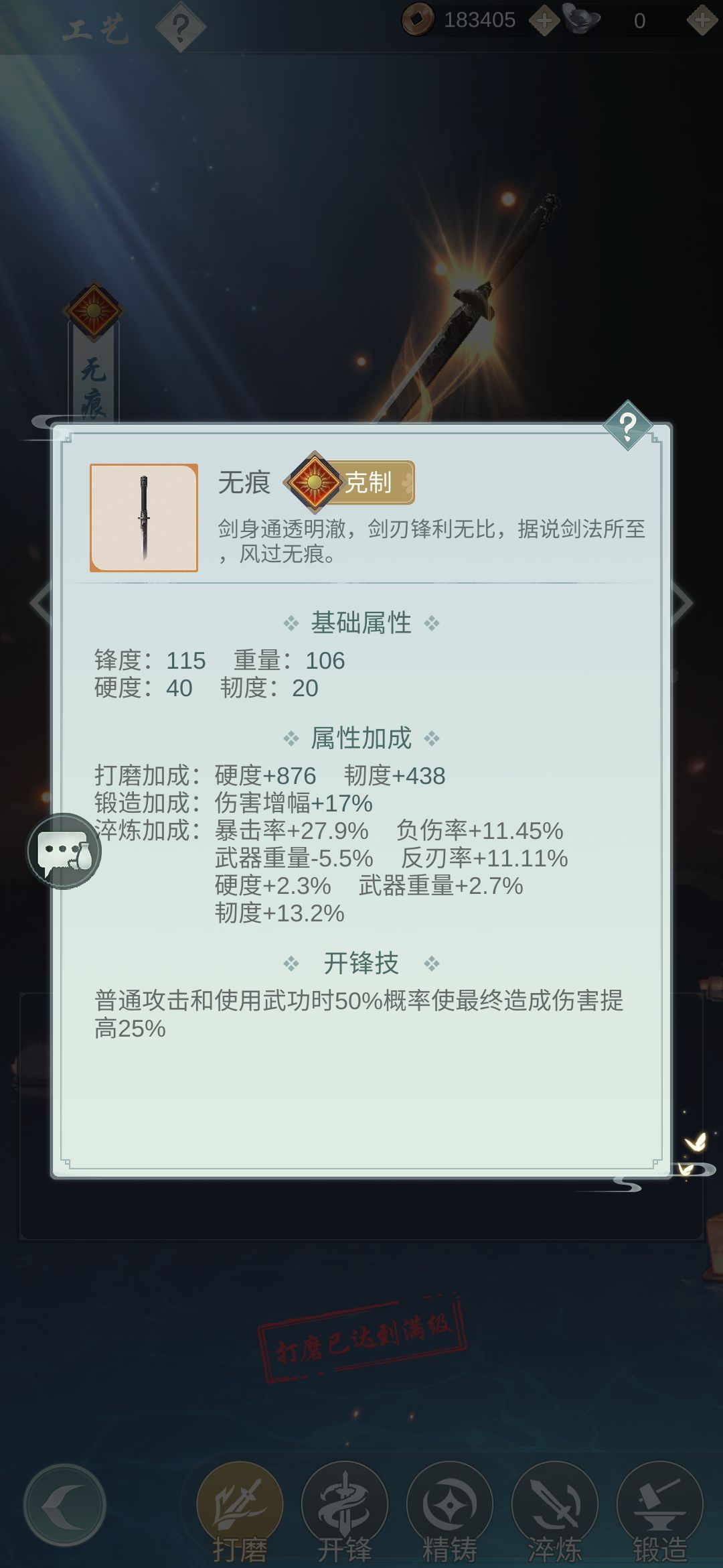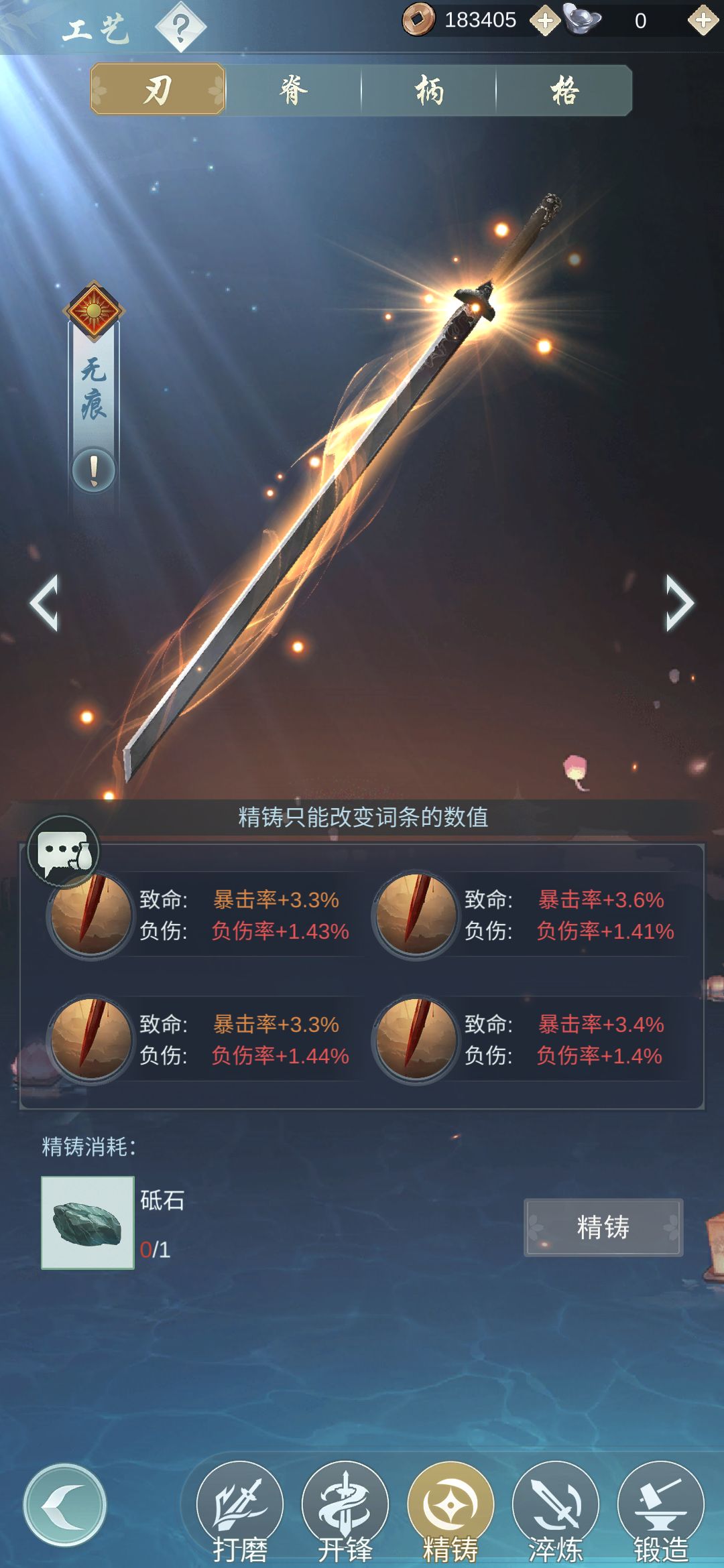 脊洗2轻1重1淬刃4反刃。由于轻镀降低的锋度少,所以1轻1重的收益高于2淬刃,但这是潜在的bug,如果修复则1轻3淬刃4反刃。重量是-3.0%。