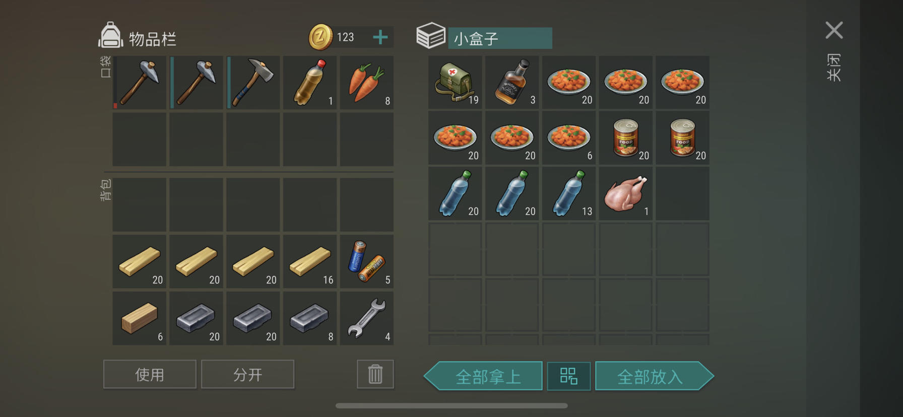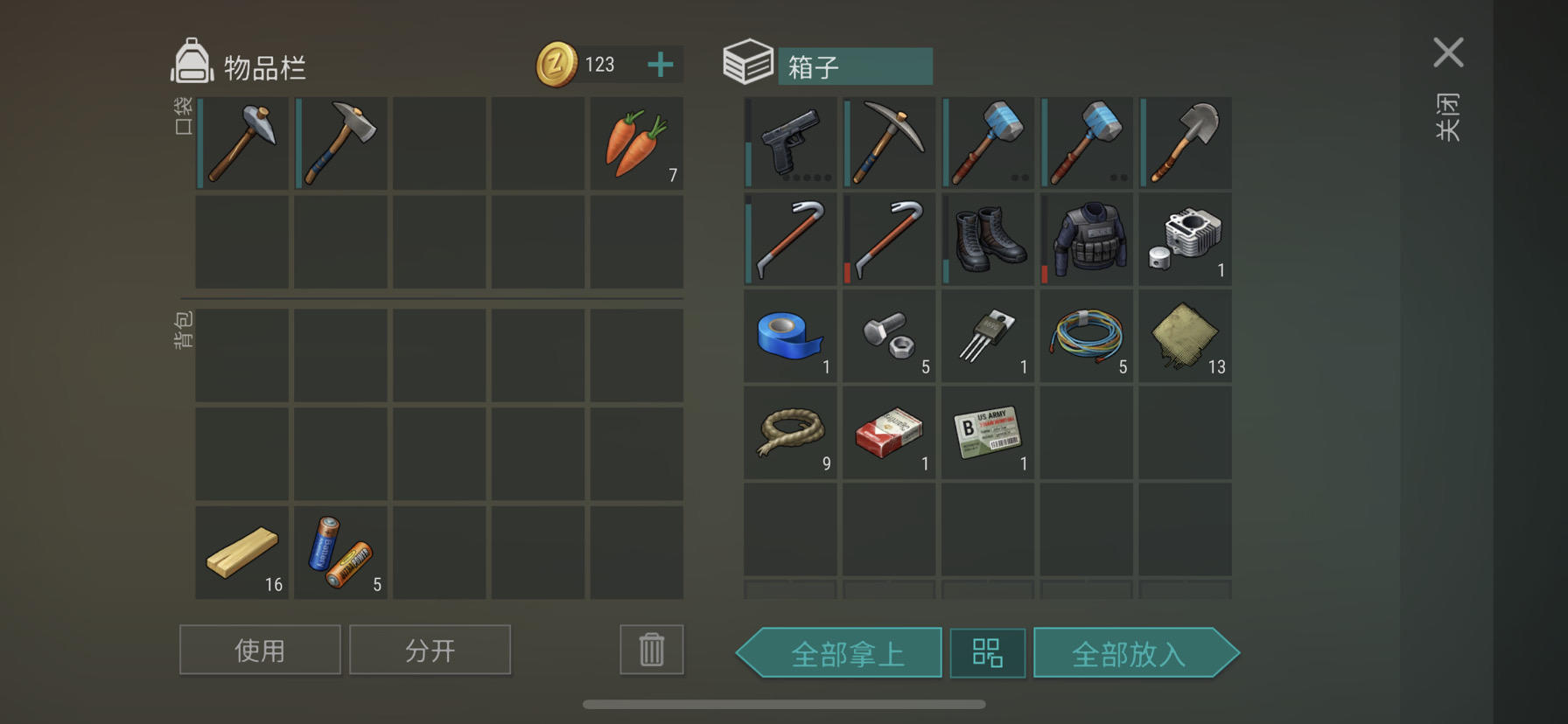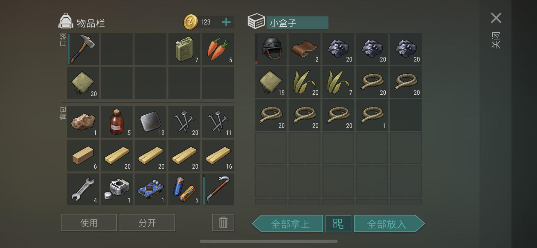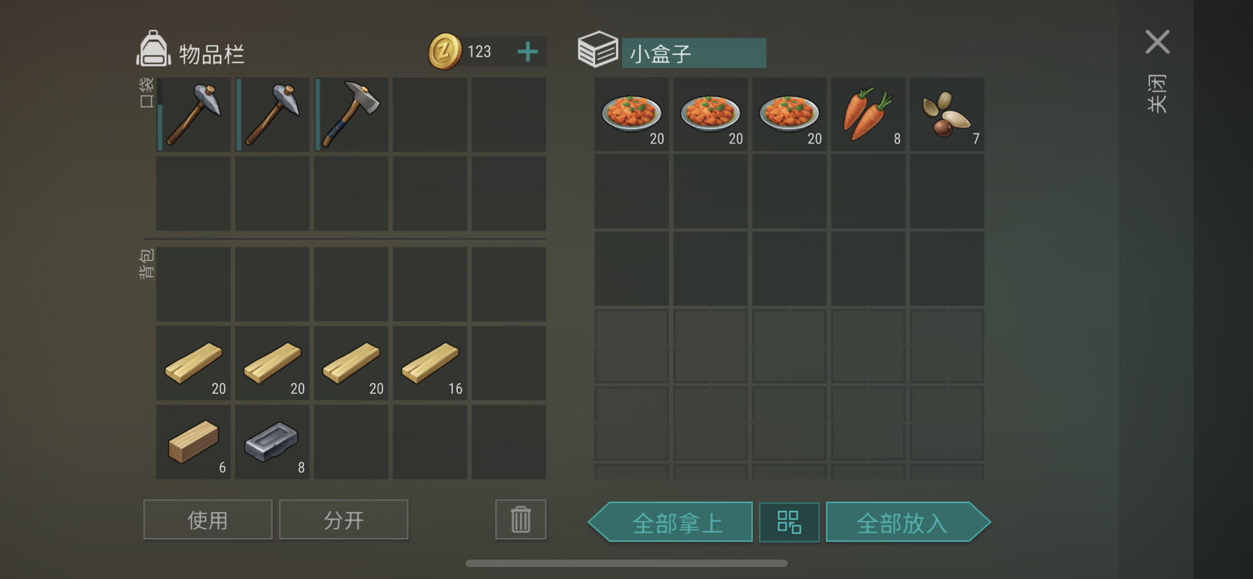 PS:两个木工台、工作台都是空的;熔炉1有7铁棒+12铁矿石,熔炉2有2铝线圈