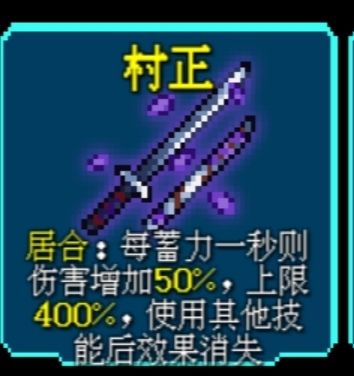 在于当你蓄满力触发特性之后,只要不停下攻击,你的每一刀都是400%的伤害加成,后期0蓄力的情况下可以每一刀都打出湮灭背刺的伤害,也因为这个特性是村正成了前期特别好用的刀