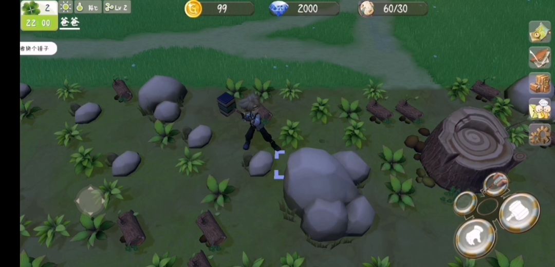 在砍伐,开矿玩法中,对应斧子和锤子;普通锤子和斧头只能锤小石头和砍树枝,要想锤大石头和砍伐树桩,则需要升级这些农具。