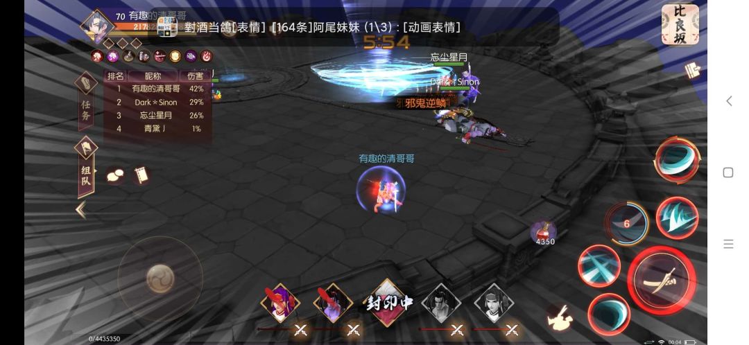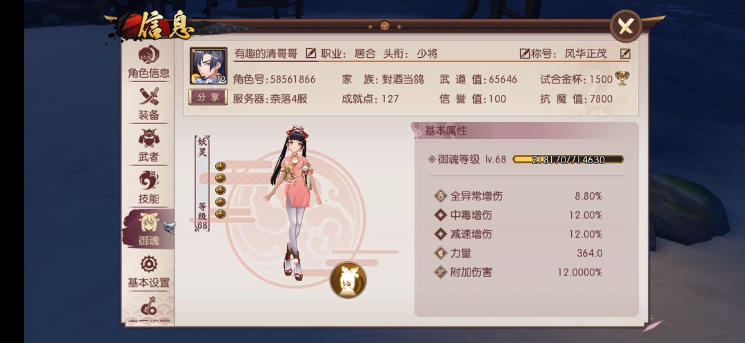 说下经过,今天早上,看tap上有人发帖说白虎辉夜适合新本,我就把十握换成辉夜了,然后斩魔多练了几次!晚上进组被踢了几次!直到进了星月的组,然后等了挺长时间才凑够4人(野队战力低难组),又喊了几个帮忙开门的,这里也要感谢他们!最后说下要点,关掉伤害数字,看boss说的话,少死的情况下,保持连击状态,磨死他!最后附上属性图