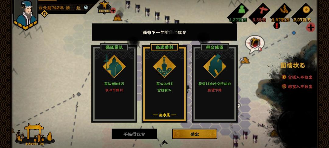 春秋战国副本无疑是当前难度最高的副本,在前期开放的几个国家中,赵国位置最好 (可以拿下白城),并且专属政令也不错。