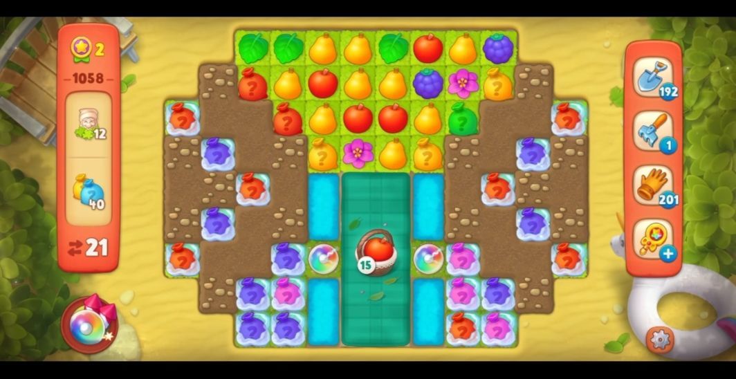 通过观察,本关总步数比较少,但障碍物和需要收集的关卡目标却很多,单从这一点就必须凑双彩,这也是花园关卡中通用的消除方法。在一般情况下步数比较少的关卡,关内都必定会有隐藏的技巧,这都需要在消除过程中去发现。