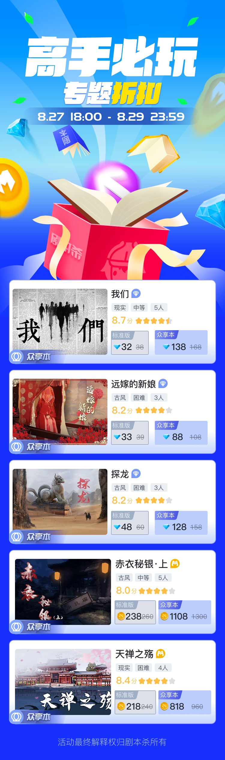 ❷大概每周会有主题剧本推荐,这些本都会有折扣的。