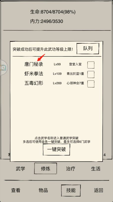 ③突破成功率不达100%想要突破的玩家,可点击武学名称置入进行突破