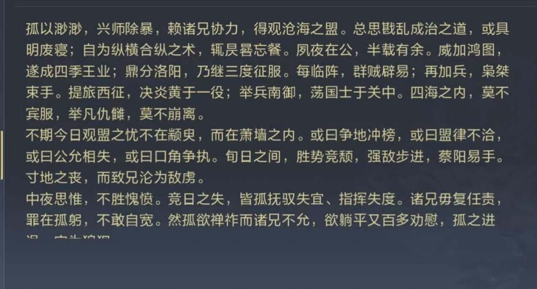 中夜思惟,不胜愧愤。竞日之失,皆孤抚驭失宜、指挥失度。诸兄毋复任责,罪在孤躬,不敢自宽。然孤欲禅祚而诸兄不允,欲躺平又百多劝慰,孤之进退,实为狼狈。