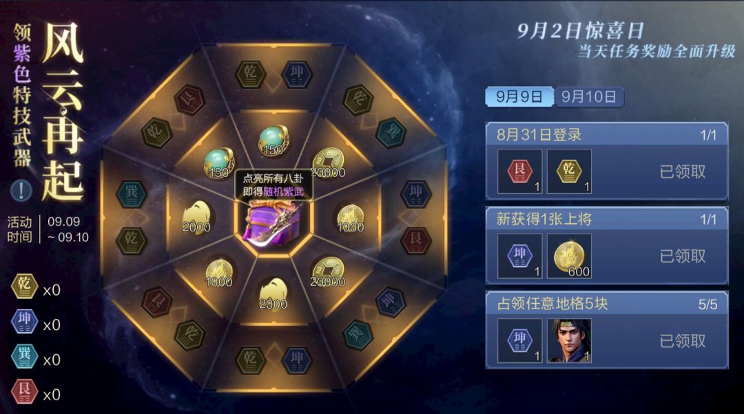 活动期间,各位主公完成活动每日任务后,即可领取对应的道具奖励,以及“乾”“坤”“艮”“巽”八卦。点亮罗盘对应的八卦,即可获得对应的铜币和珠玉奖励。点亮全部八卦后,将获得终极大奖——随机紫色武器!