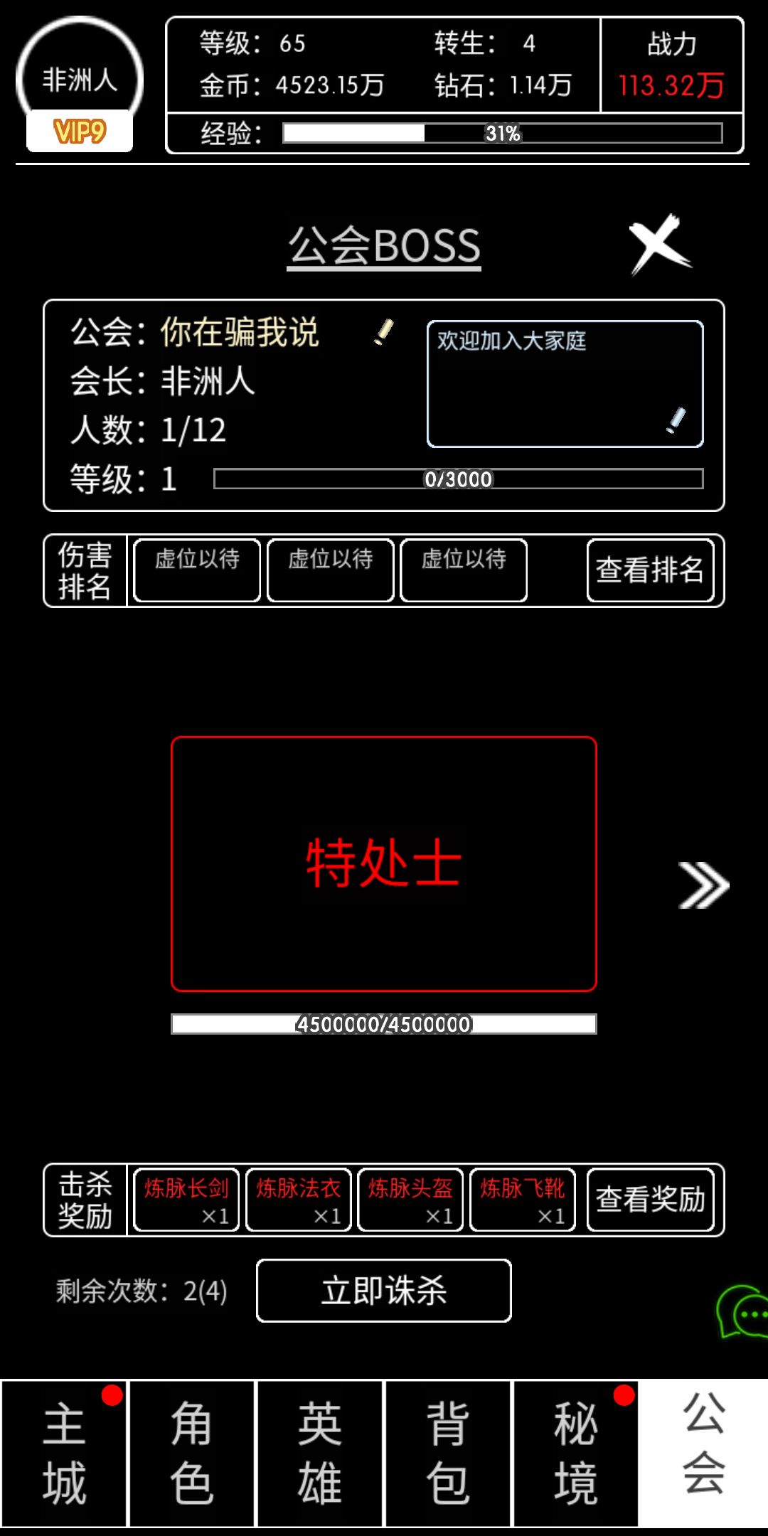 然后立刻在登入角色接着继续刷公会boss(反复操作)刷到黄袍怪就需要2级公会才能继续刷,这时我们就退出公会不需要打后续的boss只需把1级公会boss刷完就好(退出公会6个小时才可以继续创公会)然后退出公会等6个小时后创公会继续怼boss,这样一天下来可以创3次公会(一天将近100来个招募令)想要英雄的小伙伴速度来刷公会boss!