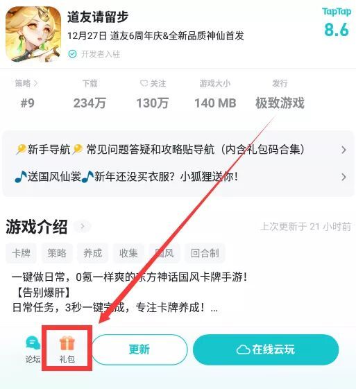 游戏详情页偶尔会有礼包码可以领,可以关注下(如下图示意)