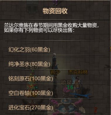 A:黑金做为游戏内主要的货币流通手段,主要由腐朽以上副本内的boss和精英怪,以及灰烬之翼以上的世界boss掉落,或者由下图所示的这些稀有道具在兰达尔圣诞树回收兑换。