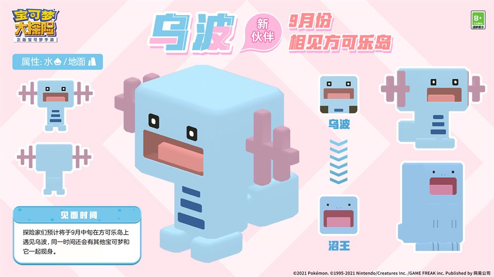 在《宝可梦大探险》前期给出的悬念图中,这位新伙伴有着在冰冷的水中生活、可以把周围空气弄湿等习性和皮肤粘膜、圆眼睛、深蓝色条纹等特点,综合上述线索,它的身份自然呼之欲出——乌波!
