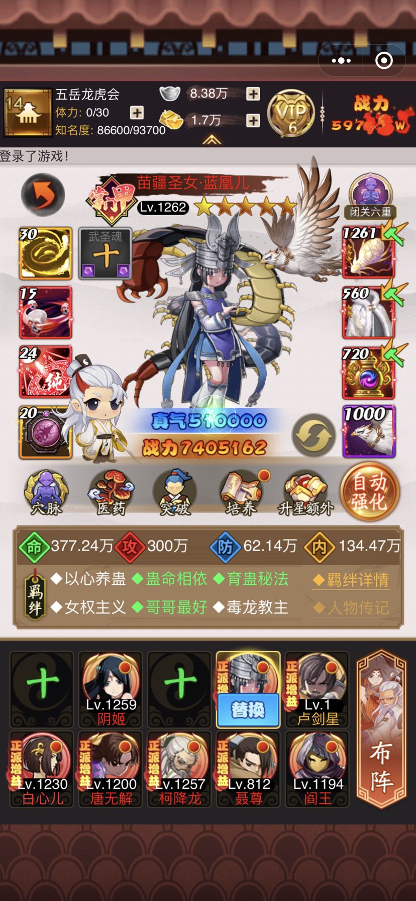 大后期:才开一次江湖争霸,不妄下攻略。