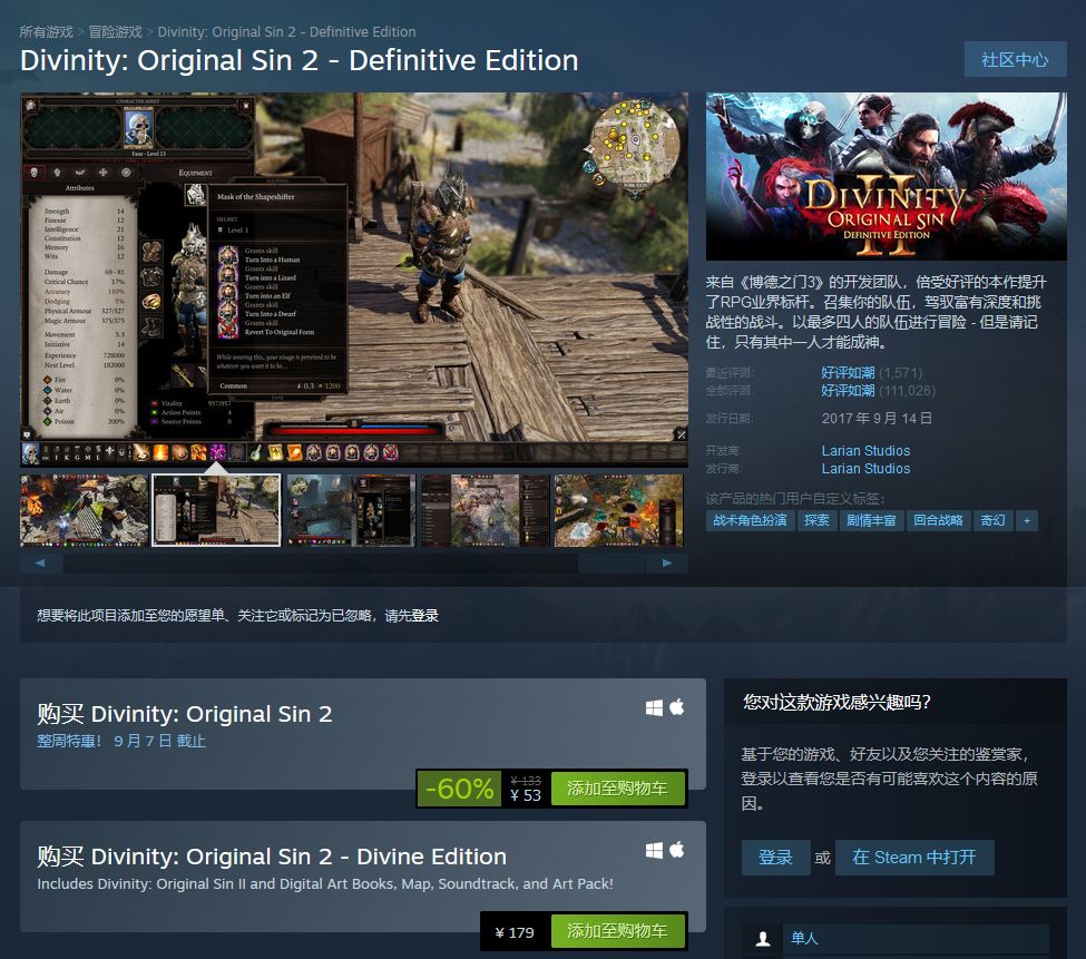 经典回合战略RPG游戏《神界:原罪2》优惠 -60%,与史低价格持平。国区原价133元,折扣后仅需 53 元。商店页面。