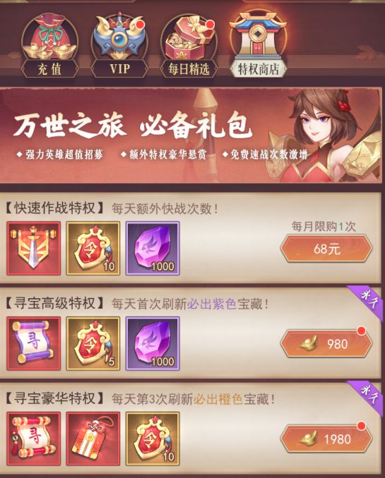 使用元宝购买寻宝高级特权和寻宝豪华特权,