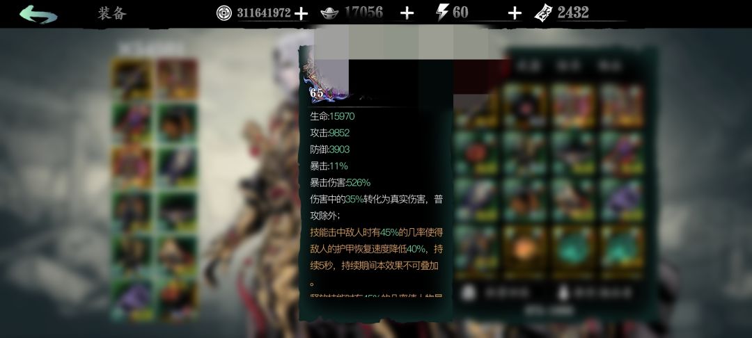 攻击9852.防御3903.因为实战有黑剑加65%攻击,身上攻击加成55%,所以有9852/1.55*2.2=13983.5实战攻击。