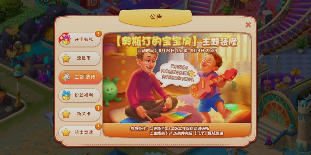 2. 关卡达到26关并且完成大厅装修