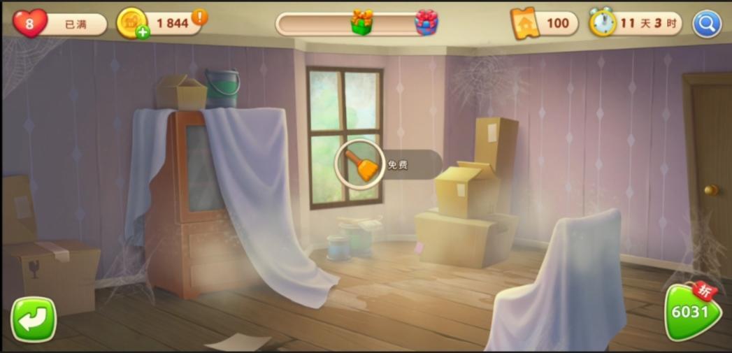 点开上图的带有箭头的图标,进入房间装饰,进入之后就是这样子,需要咱们一点一点的翻新, 装饰票需要咱们打关卡时收集装饰币。把每个装饰物拖到发光的圈圈里,可以做个选择(颜色款式)这样就装饰成功了。