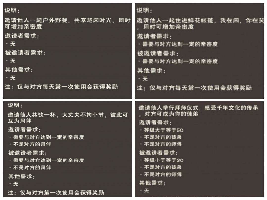 注:秋千、长凳、亭子、棋盘每个位置只有与对方的第一次增加亲密值,增加亲密值为1,古琴使用后双方获得“知音”关系,可制作结缘设施中的春游毯、鲜花帐篷每天与对方首次交互增加2亲密值,奶酒桶、拜师仪式使用后可以结交关系,冷却时间为1分钟,存在时间皆为10分钟,使用后立即消失