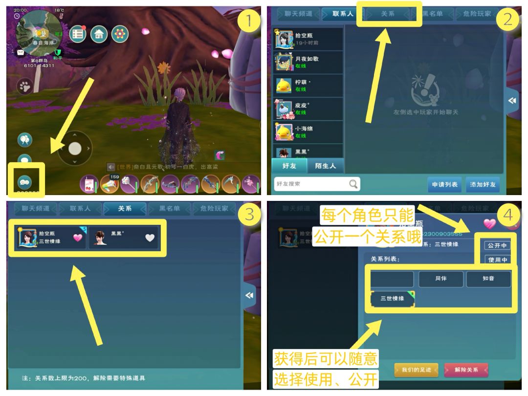 每个角色关系上限为200个,不限性别,也可结缘多种关系,但各位小伙伴还是要合理管理自己的关系哦~如果想要解除彼此的关系需要在商城花费980点券购买忘情水才可以~