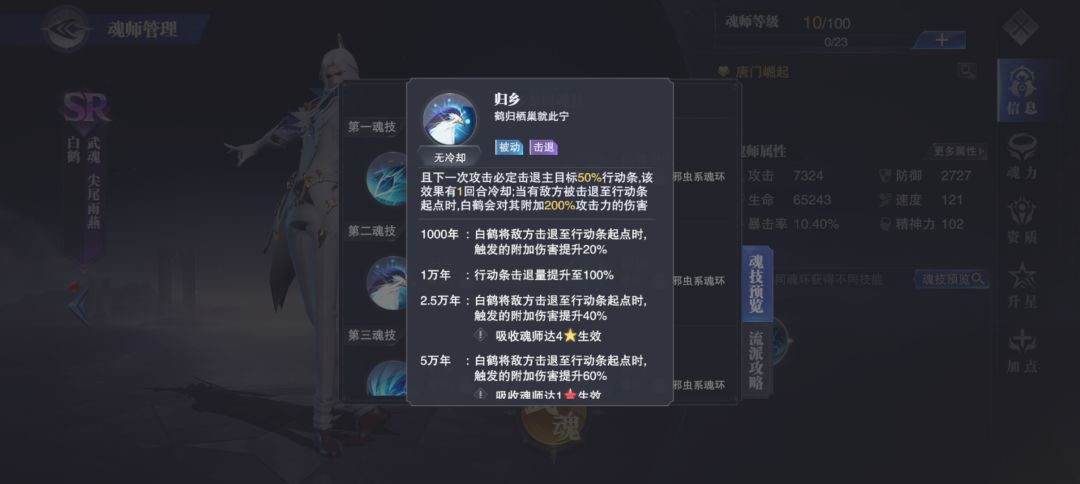 弱点:依旧很突出,敌方行动后3回合触发,如果三回合之内控制白鹤或者减员,哪怕白鹤不死,白鹤插队之后刷新被动,就又是三回合。3+3+3+...+∞,同时,这个需要5万年魂环才能触发,1红白鹤,触发不易。
