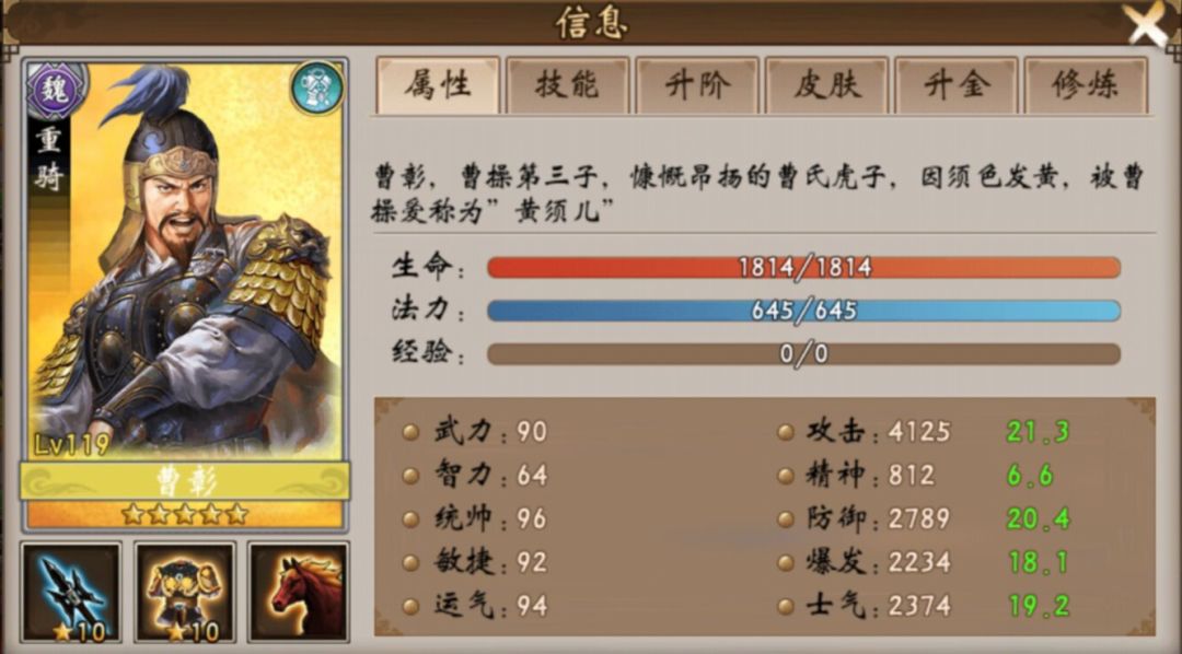 曹冲是大佬必备,回归流打法的核心武将;曹植是平民最好用的法师之一,推图和撸鲲必备;曹彰和曹丕的存在感比较弱,曹丕的印象就是有个谋身和五星的穿透移动的皮肤;曹彰的印象就是武力成长高和追四的皮肤,但是少有玩家关注这后面两个武将。但其实曹彰真是一个隐藏的王者,或者说是被遗忘的强力武将,特别是有了明光铠之后。今天我来给大家详细介绍下这个武将。